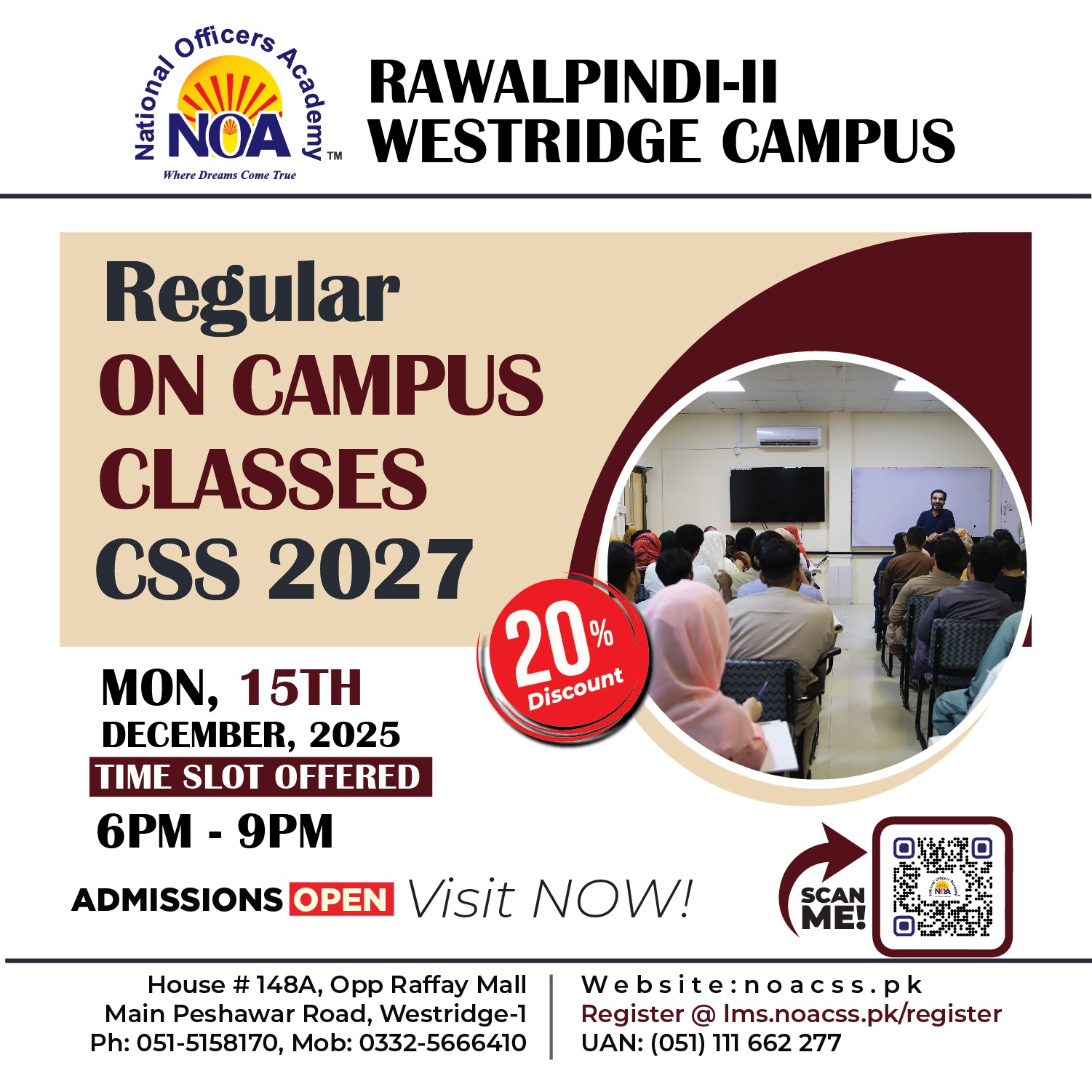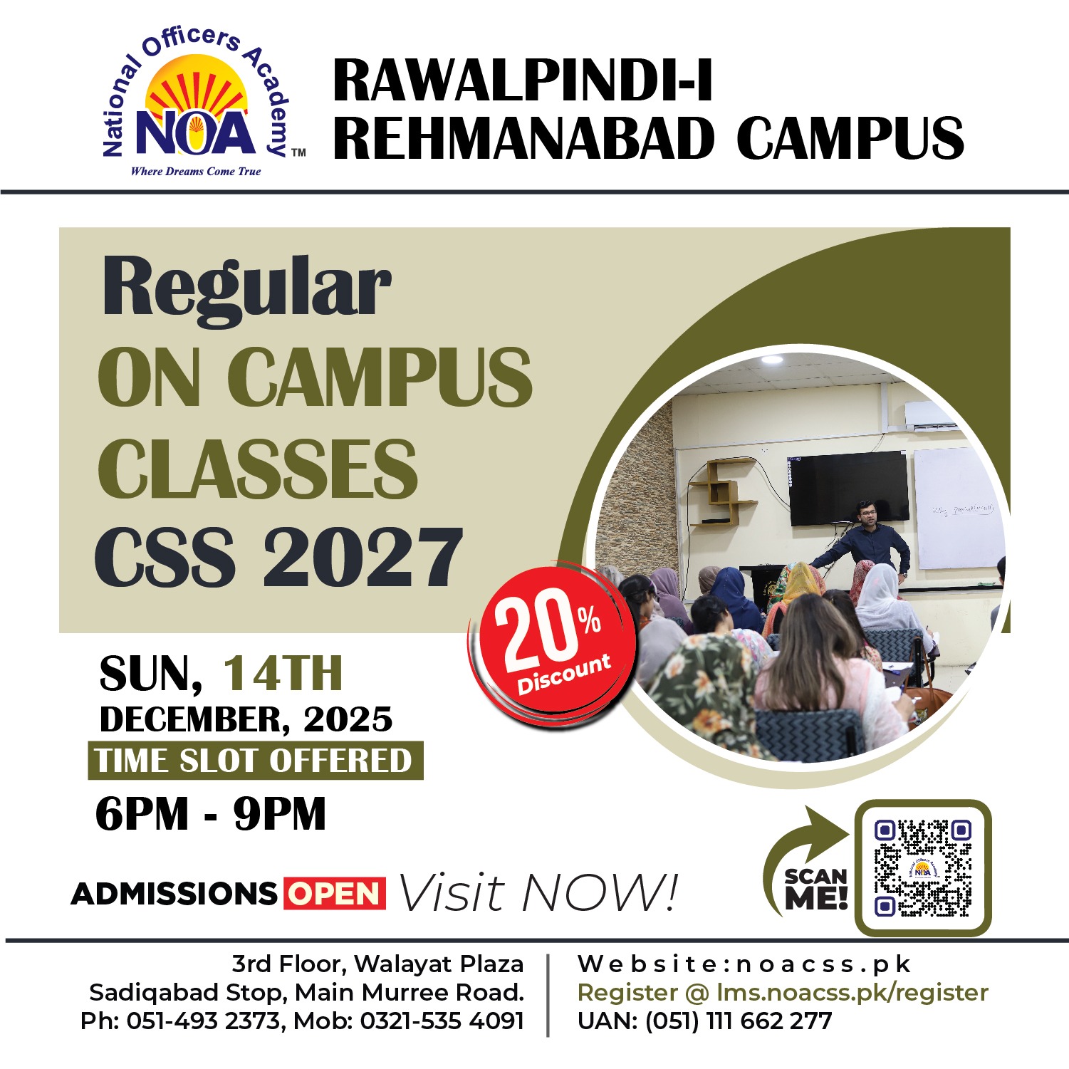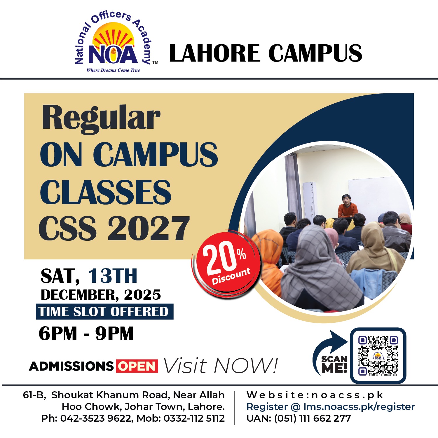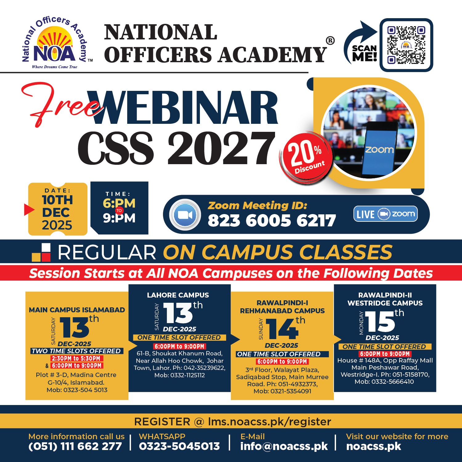 National Officers Academy Islamabad National Officers Academy ( NOA CSS ) New Campus, Islamabad, PakistanTopic Wise Test Series for #CSS2026 & Special CSS Online Free Seminar Date: 23rd November 2025 Time: 6pm to 9:00pm Live at ZOOM Link:https://us06web.zoom.us/j/83588420793 Daily Topic Wise Test On Campus […]