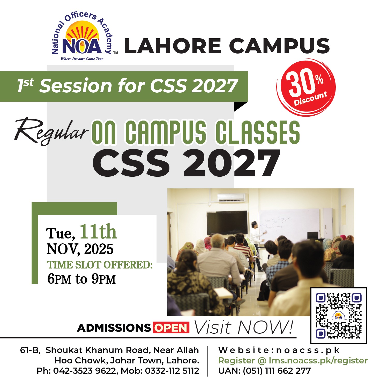 On Campus Regular Class for 1st Session CSS2027 Screening Test & Written Preparation at NOA Lahore Campus | 30% Discount