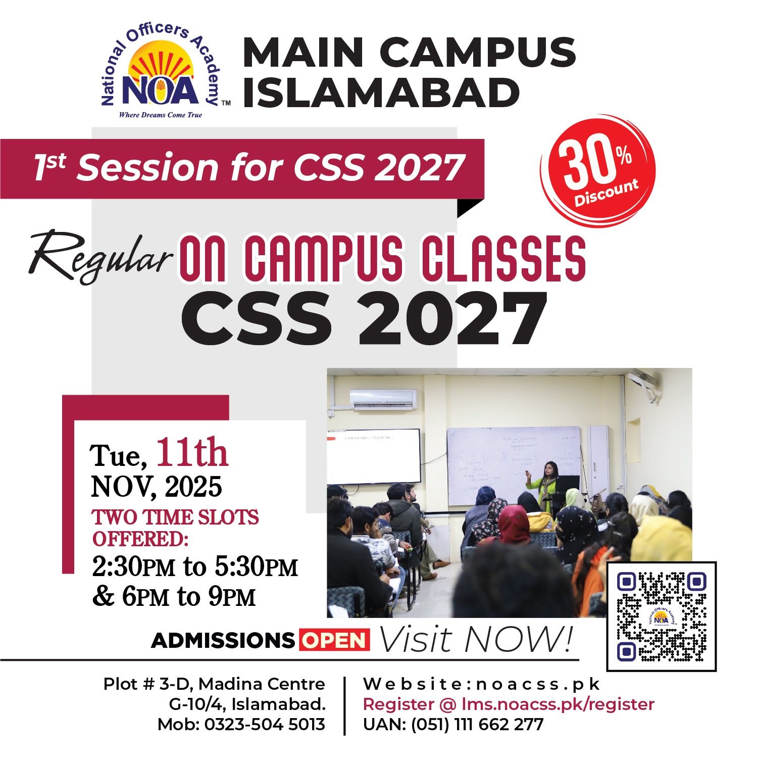 On Campus Regular Class for 1st Session CSS2027 Screening Test & Written Preparation at NOA Main Islamabad Campus | 30% Discount