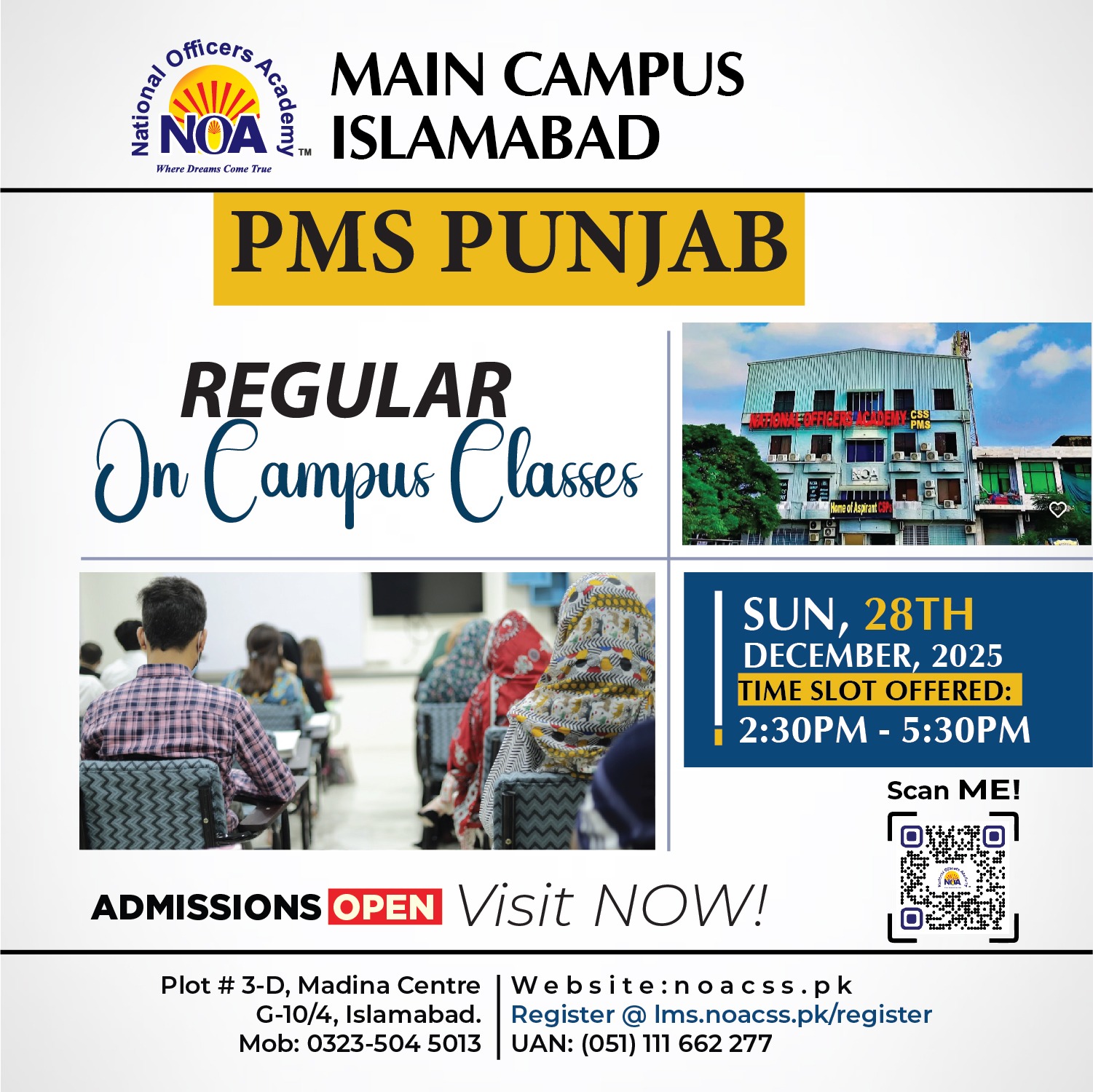 • On Campus Regular Class for Pms Punjab Preparation at NOA Main Islamabad Campus